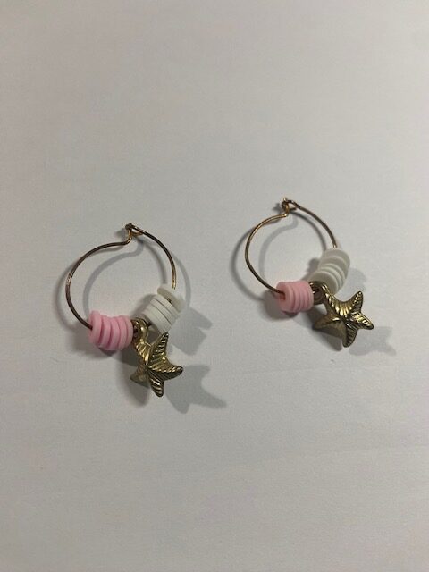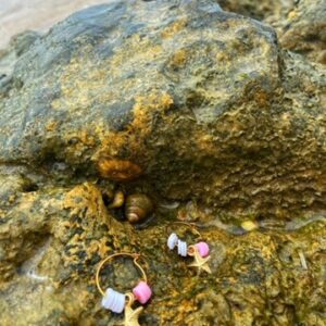 Pendientes «Estrella de Mar Rosada» – Pendientes hechos a mano con estrellas de mar doradas y cuentas en tonos rosados y lilas. Capturan la alegría y serenidad de la playa, añadiendo un toque de encanto y frescura a tu estilo. ¡Lleva contigo la magia del verano con Barrosa y Azul!